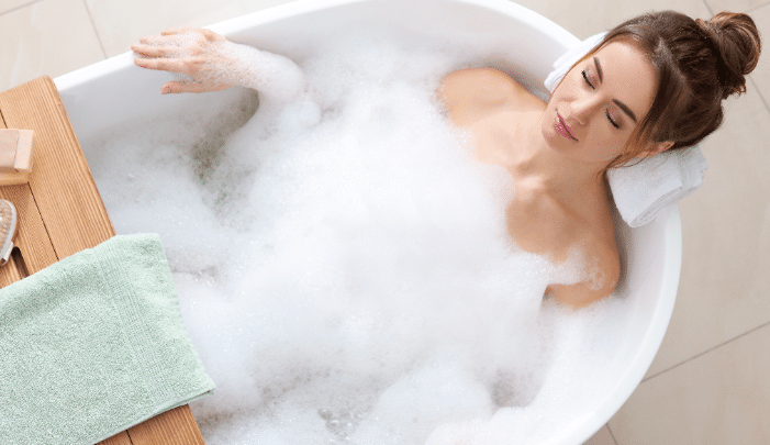 You can turn your bathroom into a sanctuary. Light scented candles, play calming music, and dim the lights. Add your favourite bubble bath liquid or foam-generating bath bomb into the water and let the scents whisk you away.